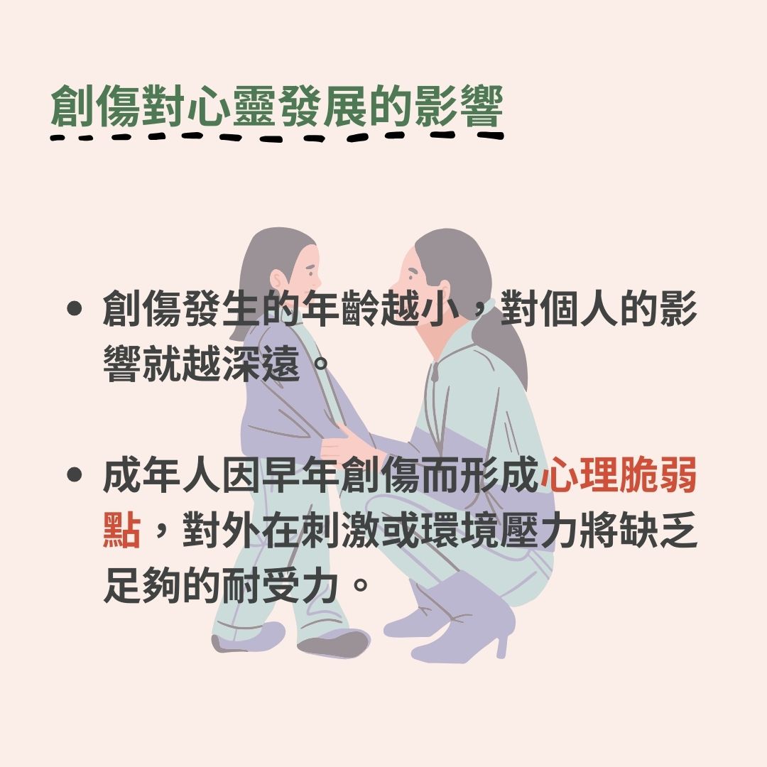 創傷發生的年齡越小,以及創傷經歷的時間越長,對一個人的影響就越大,用蓋房子來比喻發生在嬰幼兒時期的創傷就可能像是房屋在打地基階段遭遇強烈地震,或建商偷工減料,而使得支撐房屋的重要樑柱出現嚴重斷裂或空心現象,如果未能及時處理就繼續往上蓋,即使後續使用再好的水泥建材,或外觀設計得再精美,輕微地震都可能造成劇烈搖晃,強烈地震更可能導致整棟建築崩塌。所以有些成年人會因為某些早年創傷而形成某種心理脆弱點,面對類似的刺激或環境壓力會經歷比其他人更辛苦的調適過程。
