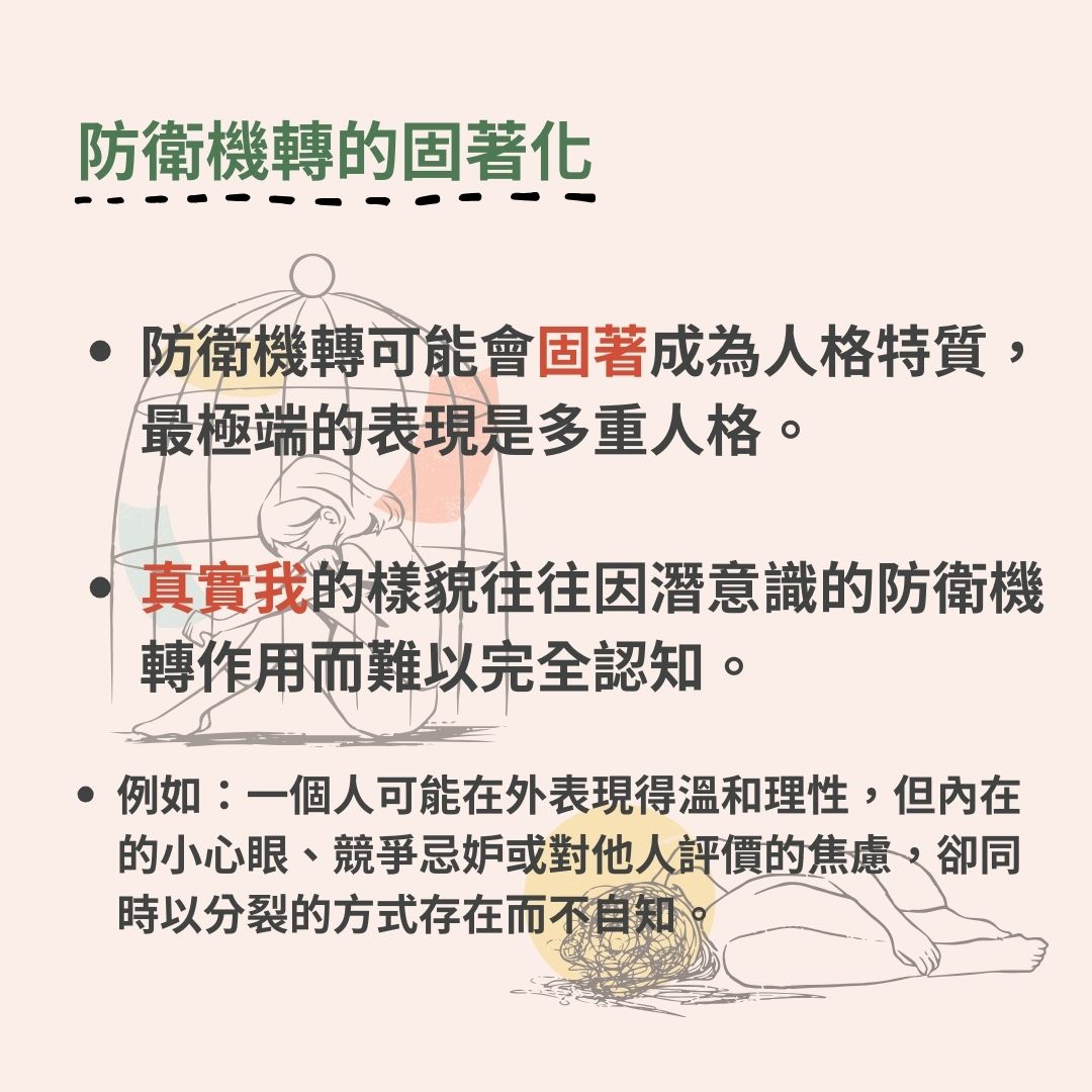 如果環境持續未能改善,防衛機轉無法鬆動,那麼這些被解離、分裂的自我部分可能會固著發展成為某種人格特質。我們知道有種極端的表現是人格分裂(多重人格),多重人格的發展是長期處於超過可以忍受的極度創傷經驗的環境中而發展出來的解離性人格,這種極端案例是少數的;然而,許多人可能以較輕微的雙重或多重人格特質方式生活著。