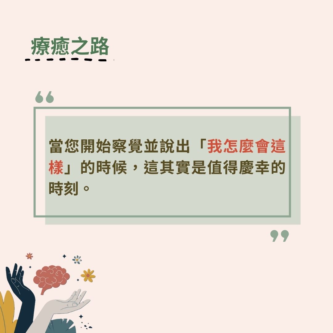 當您開始察覺並說出「我怎麼會這樣」的時候,這其實是值得慶幸的時刻。這代表被解離分裂的部分已經被意識自我看見,也開啟了心靈成長與自我整合的契機,這使我們能夠期待未來能以更真實、更完整的方式活著。