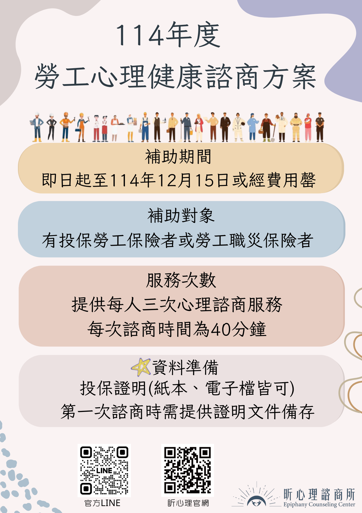 財團法人職業災害預防及重建中心為降低工作者心理壓力求助門檻,提供三次免費心理諮商服務,即日起-114年12月15日止或經費用罄,只要符合方案資格者,即可預約進行!
